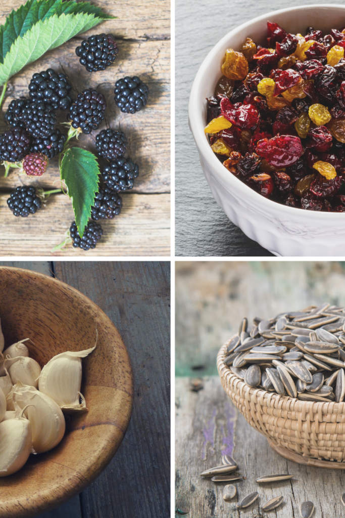 Cooking Ingredients: pumpkin seeds, sunflower seeds, peppers, onions, garlic, raisins, blackberries, and ginger.